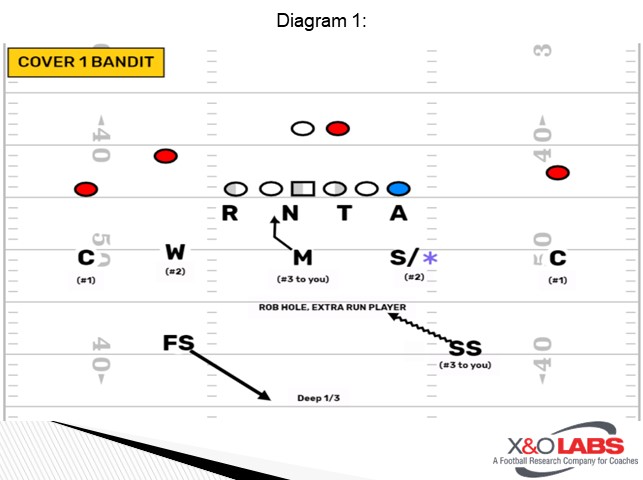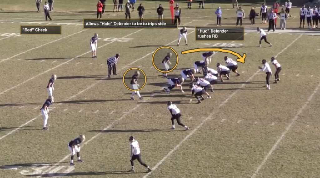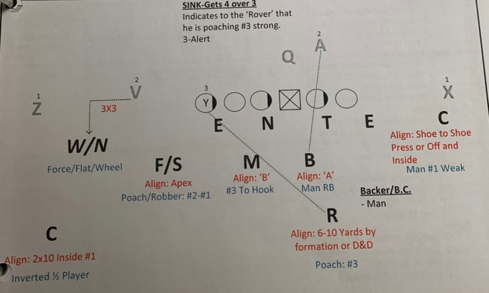 It’s important to note that he treats H/Y off formations like three-surface formations so the Mike would walk up and pressure the edge, leaving the Whip to play the Tight End. The safeties can now “chain” off the Y (because it’s a man coverage concept) or the safety to the side of the tight end can track him. Meaning, if the tight end blocks, the safety can add to the fit and be a bonus defender.