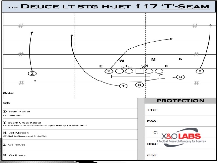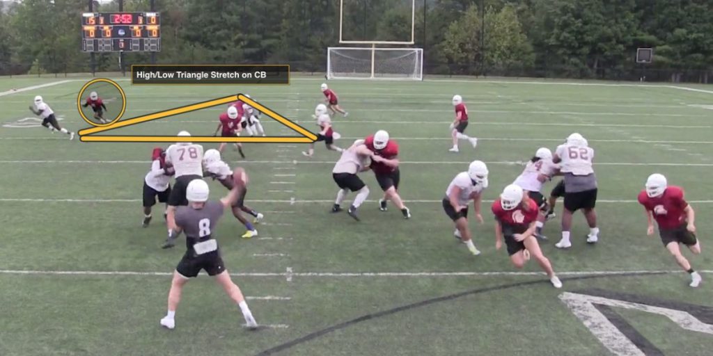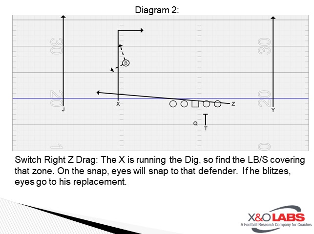 In the passing game, these pressures get translated into two on one matchup on the back when the tight end blocks. Against pure slide protect teams, I’ve found that he will continually make “Tango” calls, which tells the defender to the side of the tight end to blitz. And if the tight end blocks, the Mike or Backer to his side becomes another scrape rusher. This is where you get two on one with the back.
