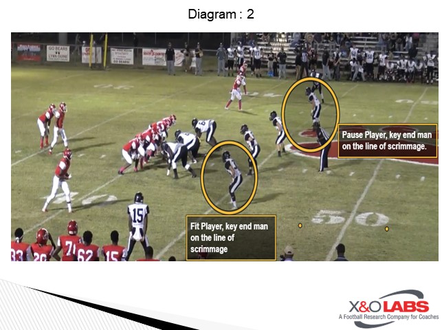 One of his built-in adaptations vs. slide protection was for first level defenders to the side of the pressure to cross the face of linemen that were setting the slide to them. As shown in the image below, this can alter the protection schemes and promote the possibility of a free rusher.