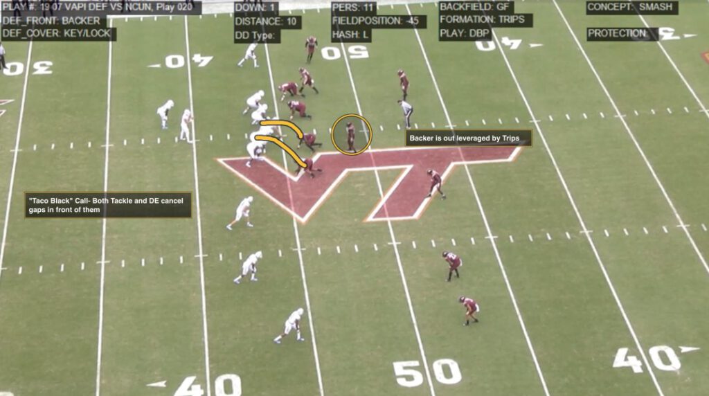 Once offenses got clued to the Hokies adding to the back, they would work to cross their back in protection to eliminate the extra add on blitzer. So, when offenses would start to “scan” the back in protection by having him work opposite, “B.O.B.” pressures (Blitz Opposite the Back) principles were built in. The linebacker (either Mike or Backer) would be the blitzer while the other would play A gap to ball or add-on as an additional rusher and he may choose to swipe the front to the side of the pressure.