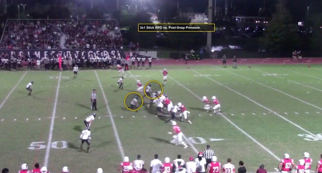 When we run RPO’s, we want to establish the downhill run. We don’t call RPO’s to throw the ball more, we utilize them to manipulate numbers in the box to ultimately give ourselves “light-boxes” to run the football. We drill this mentality into our QB from day 1 install. However, when he goes to throw that pre-snap or post-snap RPO, he has the tools and techniques to be successful and fluid.