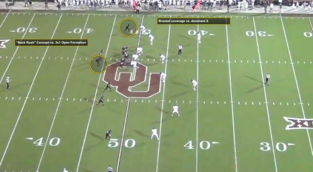 In 3×1 #1 strong usually, by a general tendency we have found, gets the ball the least due to the distance away from the QB so the split of #2 and #3 in terms of inside, outside, or vertical routes they may be running can have an effect on where pressure is coming from due to how long the QB is designed to hold the ball in terms of quick game, 5 step, screen, RPO, play-action, etc.