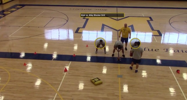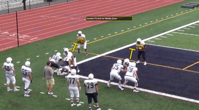 The footwork for pull blockers is taught as an open, crossover progression. Pull blockers will open their play side foot (Coach Giufre calls it a ‘wedge step’) and crossover with the backside foot. “It doesn’t matter if their shoulders are turned,” he said. “If they open up a little bit it helps them sift things out. The ball is out of the box anyway. It’s not like counter or power scheme.” As far as the strike point goes, Coach Giufre teaches a double under technique (made famous from John Strollo and Jim McNally lectures) on contact. “Rather than pushing a guy, you’re lifting him,” If you can get hands underneath and lift shoulder pads it chokes defensive linemen. They will naturally stand up to find air.” Once the target is identified (which is usually the first defender past the identification) there is no shimmy, or no entry point through the line. It’s a complete run. There are two types of blocks synonymous with these assignments: