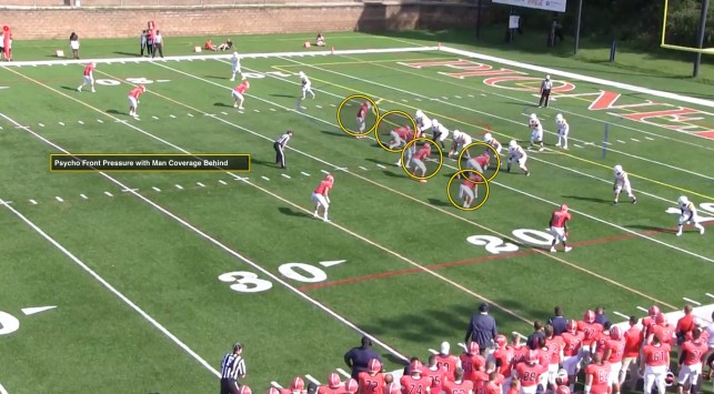 While the coverage can routinely change, one thing will not: there will be a safety in the middle of the field. And at the hierarchy of the Red Hawks defense sits its bread-and-butter coverage- Rip/Liz Match, or what Coach Agresta calls “Cover 9.” It’s the latest off shoot of man vs. zone, it looks like Cover 3 when it needs to and it looks like man coverage when it needs to look like man. It’s a coverage commonly associated with five-man pressure defenses and Montclair State runs it just as good as anyone.