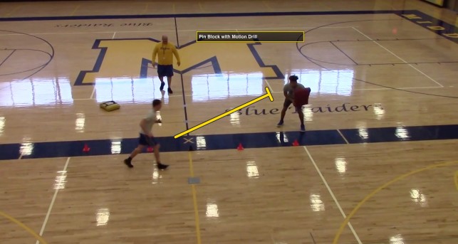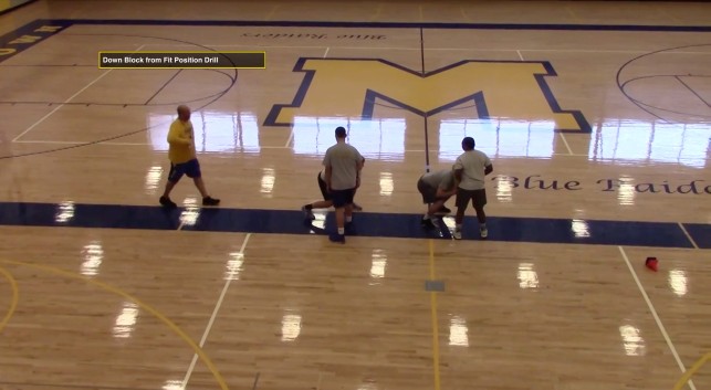 The concept of the down block is to negate penetration by working your hips around to block the defender. While some coaches teach a play side vertical step to account for any possible crossing of the face, Coach Giufre teaches a gap step with the first step. The second step is the lead step with the third step being the follow step. “On the gap step, we step with the foot closest to defender, while the lead step works slightly up the field,” said Coach Giufre. “In our position step, we set our eyes to the aiming point (which is the near V of the neck of the defender). Eyes should be in near V of neck. Like baseball, we try to keep our eyes on the ball. If we get eyes to aiming point and our body will follow.