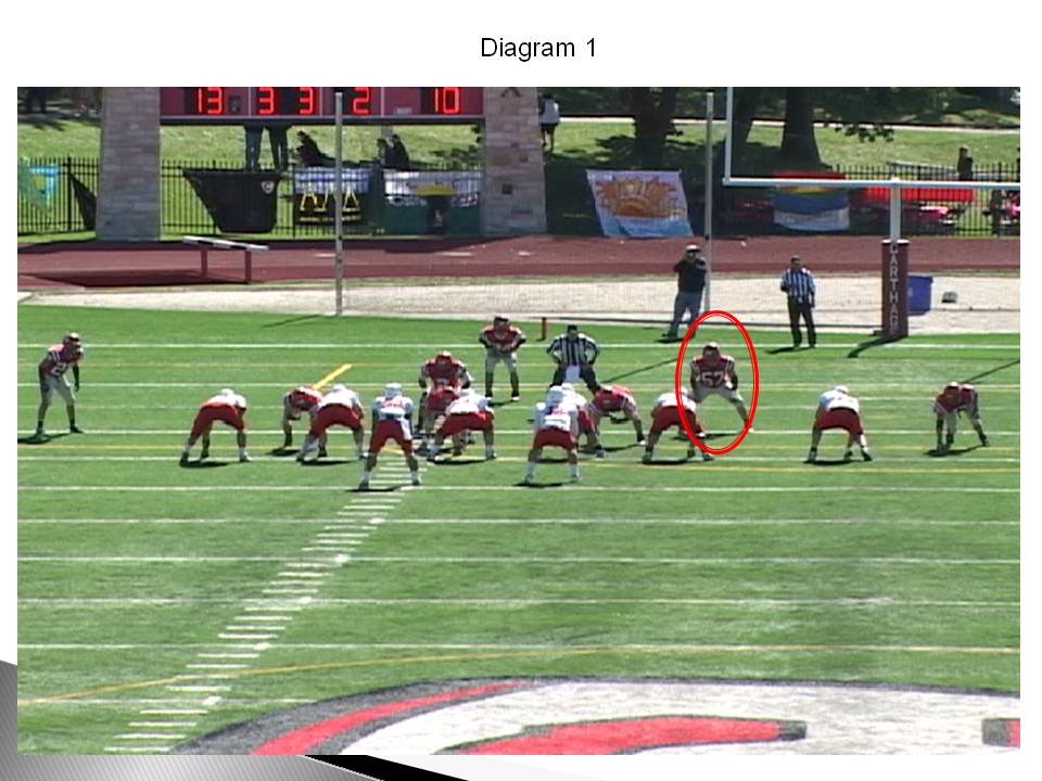 To truly understand any running play, it all starts with the offensive line and their identification of the front and the blocking techniques that they are going to use to block the myriad of fronts they will see. The first thing that the Trinity OL will do is identify the front as either odd or even according to their rules. Next, they determine who the Mike backer is and that will determine the combination blocks or man blocks being made on the MZ play. On any even front, the front-side tackle is by himself on the end man on the line of scrimmage. The play-side guard and center are working together for the Mike backer and first down lineman past the center. The backside guard and tackle are working for the first adjacent backer away from the Mike and the next interior down lineman.
