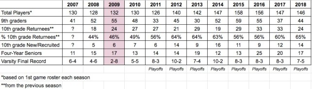Our participation study showed two things: 1) improvement doesn’t happen overnight and 2) at some point your program will likely hit a participation plateau. The key to growing your program is you cannot rest when you hit that plateau. We work as hard as ever with looking for athletes at our school, and retaining them when we find them. While our numbers have stayed pretty constant the last few years, our program accrues playoff experience and the expectation of success with each winning season. Below, you will see the quantifiable increase in numbers in our program over the last twelve seasons.