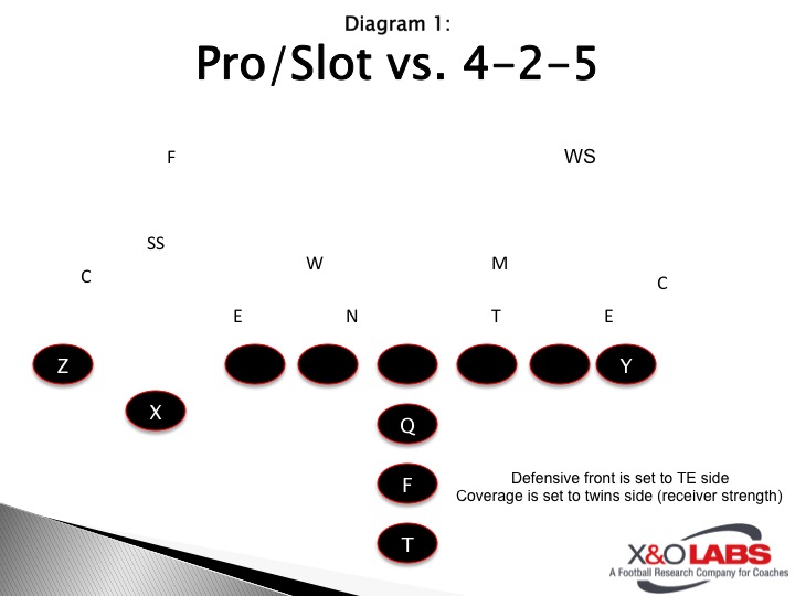 It’s a fact that 68.5 percent of coaches that run the 4-2-5 scheme call their front separate from their coverage.  This means that while the strength call for the front four may be in one direction, the coverage strength (which is usually predicated on the passing strength) could be called opposite.   An example could be a pro/slot set (Diagram 1).  While the strength of the front may be called to the tight end, the coverage strength would be set to the twin receiver side, it is the side with the most eligible receivers.