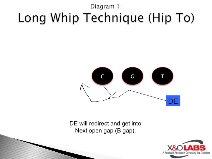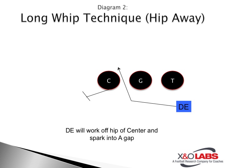 Long Whip: This is used by a defensive lineman to the side of the blitz where he needs to get two gaps inside on the snap of the ball.  Usually, he’ll read the adjacent hip of the defensive lineman in the gap he’s aiming for.  If that hip comes at him, which means the gap is closed, he’ll redirect into the next open gap (Diagram 1).  If that adjacent lineman’s hip goes away, he continues to penetrate the intended gap (Diagram 2).