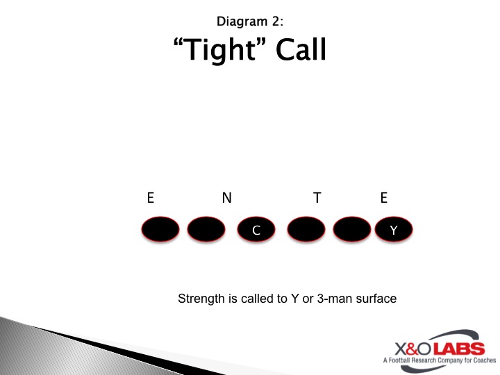 Tight Call: 3-technique aligns to the side of the tight end (Diagram 2).  Our research found 81.9 percent of coaches prefer to set their front this way.
