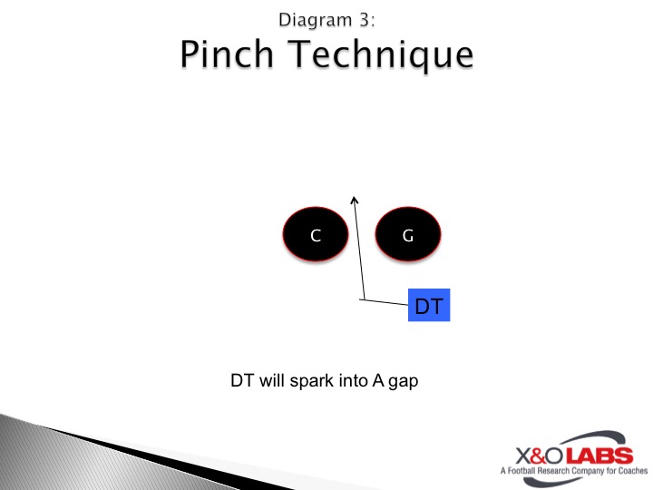 • Pinch: This is simply a one-gap stunt to the side of the blitz.  Coaches will differ on whether they want a lateral or flat step used by the defensive lineman on the stunt.  Either way, it’s his job to get into the next adjacent gap (Diagram 3).