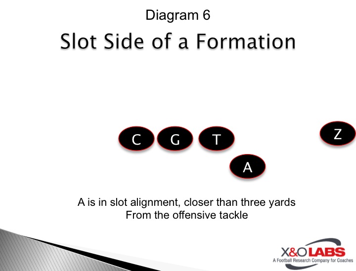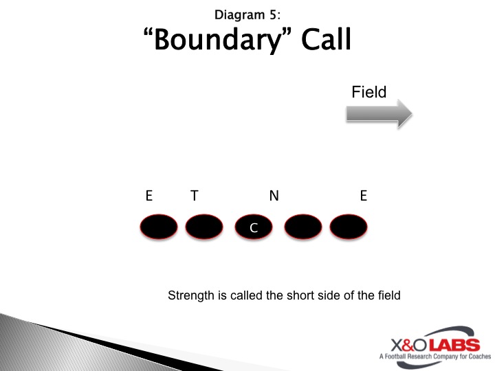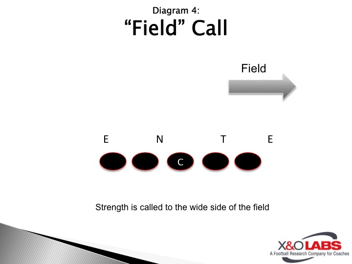 Field Call: 3- technique aligns to the wide side of the field (Diagram 4).  Our research found that 18 percent of coaches prefer to set their front this way.