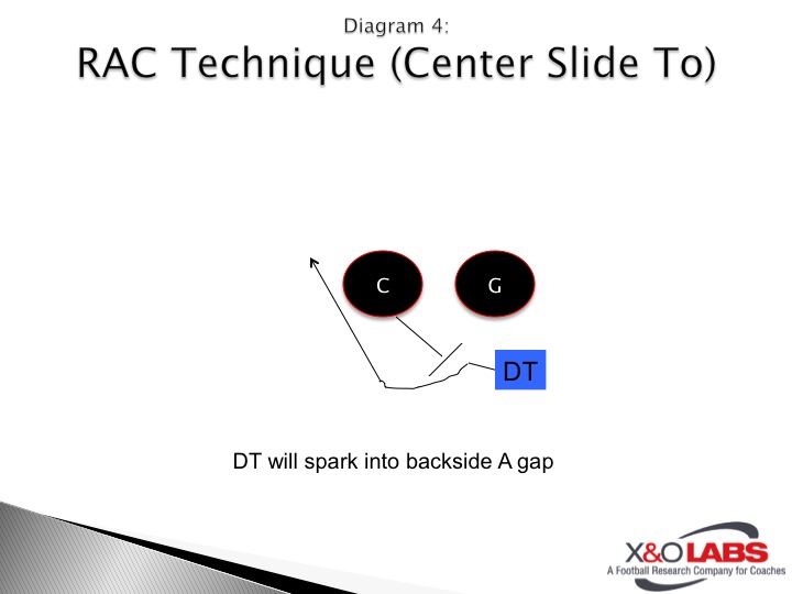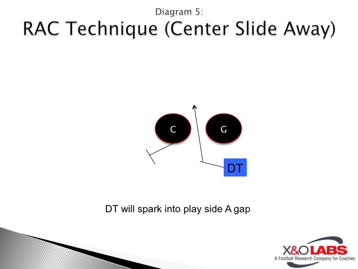 • RAC (Rip across Center): This is mainly used by a defender to the side of the blitz whose job it is to get across the Center’s face to the opposite side of the blitz.  Sometimes it’s necessary to take a more lateral step as to not get knocked off course.  We’ve spoken to coaches who will monitor which way the Center sets because he is often the key in the slide protection scheme.  If the Center turns toward him, he will cross his face (Diagram 4) with usually a rip move.  If the Center steps away, the defender may stay on track in his gap (Diagram 5).