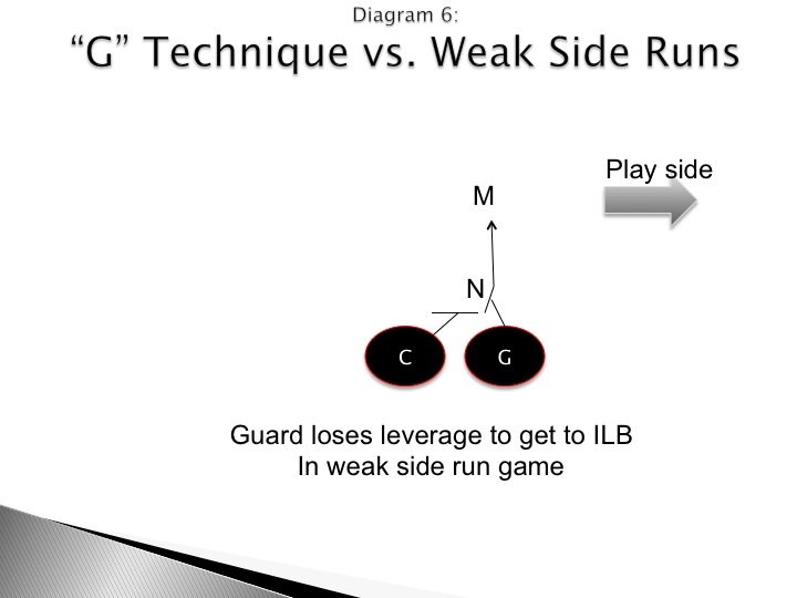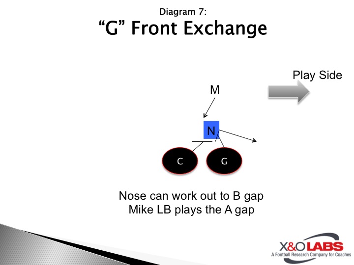 “The Center is always going to spend time on him, so now we can play aggressive on the inside shoulder of the guard in any zone schemes and if the Guard climbs we should be able to take the B gap and have the backer exchange gaps with us by playing the A gap (Diagram 7).”