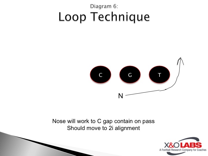 • Loop: This technique is used by a defensive lineman to the side away from the blitz who is responsible for contain if pass develops.  This player must work to get depth post-snap to ensure the proper angle on contain.  If this is a Nose Guard, he will usually cheat to a 2i technique or a 3-technique can commonly get there from his original alignment (Diagram 6).
