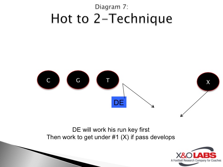• DL on Hot to 2 Player: This may be self-explanatory, but any first level defender that is responsible for coverage in zone pressure schemes MUST play run first by getting his run read first off the key he is on, which is the offensive lineman he is aligned on.  If that defender gives a run read, there is no reason for the DL to execute his pass responsibility, instead he should continue on his run technique (Diagram 7)