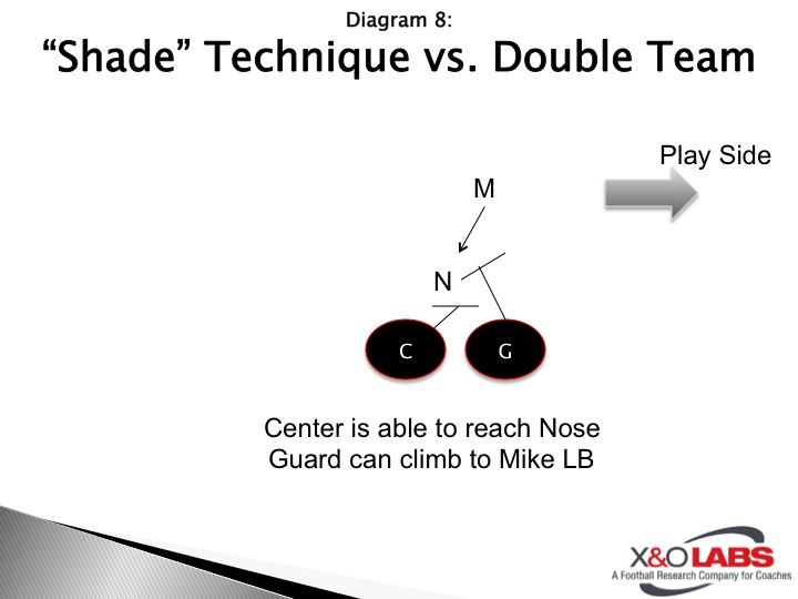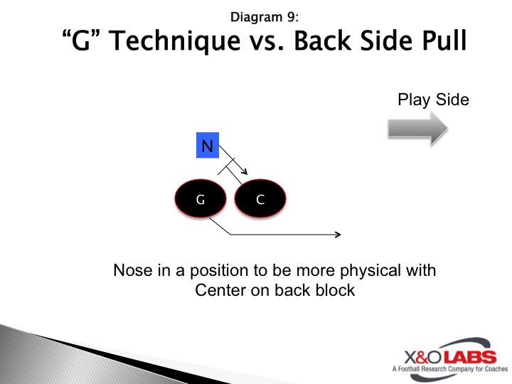 When we played with the shade technique, we’d get the true double team and the linebacker would stick his head in the B gap and get blocked.  “The Center would wind up overtaking our shade technique because he didn’t have a good leveraged position on him (Diagram 8). That 2i technique also gives the Nose a cleaner shot on the back block and pull by the guard on power (Diagram 9).  It gives him leverage to slam that Center on the back block rather than getting pushed up field.   The hardest thing we do as coaches is tell that Nose to switch from a 2i to a shade technique.  He should have to learn one spot so that the Guard only has one choice on combination double teams or gap double teams.