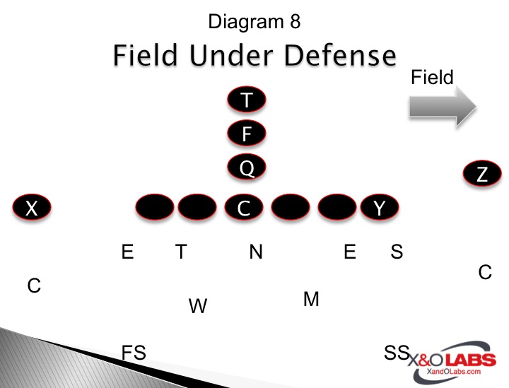 Since this is usually the starting point for most offenses, we will start here on defense as well.  When conducting our research, this is an area we wanted to explore.  There are various schools of thought on this formation.   Some coaches feel as if an eight-man front is needed to play against two-back offenses, thus opt for using man-free or Cover Three principles against these structures.  Chris Ash, the defensive coordinator at the University of Arkansas is one of those coaches.  Ash prefers to play more of a “Field Under” defense (Diagram 8) against two-back pro-style offenses because of both a numbers disadvantage and a depth disadvantage for the safety.