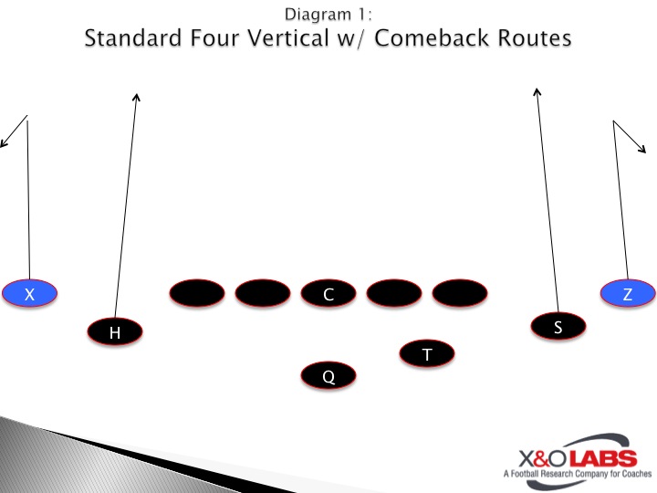 Considering all things equal, with the ball inside the hashes, 59.8 percent of coaches teach the bottom of the numbers as a post-snap landmark for their outside receivers.  In the four vertical concept, it’s the outside receiver’s (or number one as their commonly referred) job to stretch the cornerback and adjust this route off of them. While giving coaches the option of whether they teach a comeback, stop or speed out route on the outside – 67.8 percent teach comeback routes (Diagram 1) in their four vertical package.  Of these 67.8 percent of coaches that teach the comeback, 36.3 percent teach a 15-yard break point while 32.6 teach a 12-yard break point when making their decision to adjust to the corner.  We’ve found that this all depends on where the receiver can get leverage on the corner, thus making it easier throw for the quarterback.