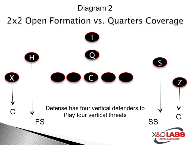 Always a topic of conversation among coaches that use Quarters Coverage is how best to handle 2x2 formations.  It seems that the structure of Quarters coverage itself is ideal for 2x2 formations because you have the ability to handle four vertical threats with four secondary defenders without risking any underneath defenders in coverage (Diagram 2).   Once the slot receivers are able to cross linebacker depth, a safety is able to jump them right away.  Playing Quarters coverage against four vertical threats often gives offensive coordinators problems because a defense forces a tight window (between the second level and third level defenders) to place the ball.