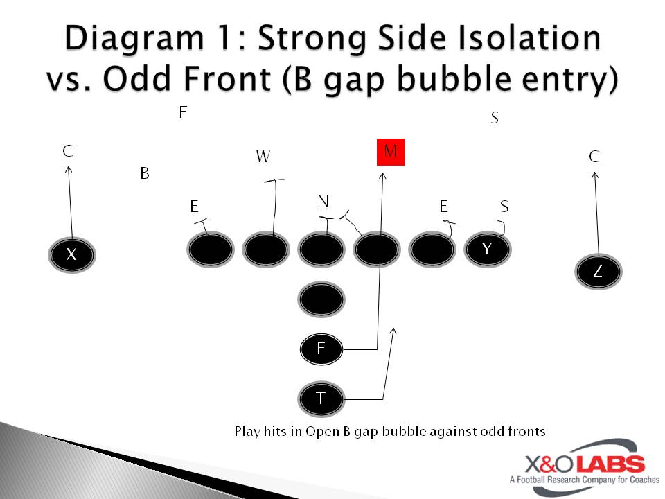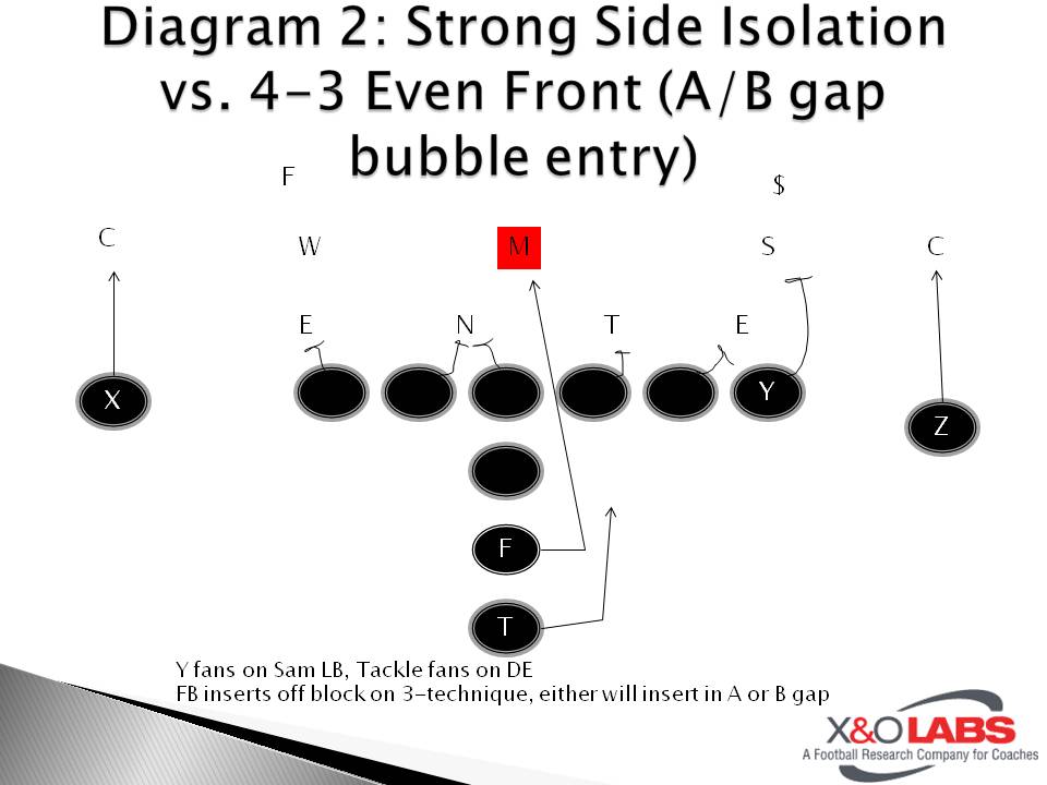 Where you insert that fullback is clearly open to interpretation, but many of the coaches we surveyed like to insert him in the first open gap to the play side of the scheme, which typically is an A or B gap bubble.  Of course, this may change depending on the front.  Against odd fronts (those most susceptible to inside isolation schemes) the open gap is the play side B gap which is where the fullback will insert (diagram 1).  But against, four down front (4-3/4-4 teams) the question is not only where you insert the fullback but how you block the front.